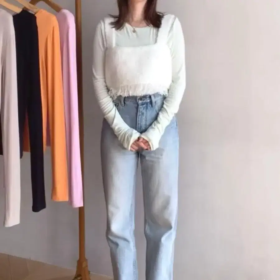 • AMERI 아메리 시어 탑 프릴 시스루 이너 하이넥 긴팔