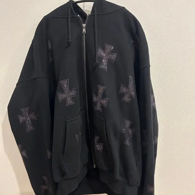 크로스 무늬가 특징인 블랙 후드티, L 사이즈, 지퍼 부착. - 색상: 블랙 - 디자인: 크로스 무늬 - 사이즈: L - 특징: 지퍼 부착, 후드 부착 방문해 주셔서 감사합니다. 사이즈 - M