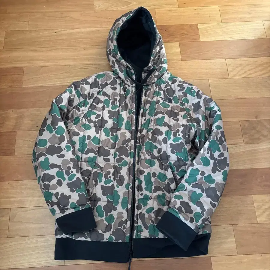 자동 번역되었어요. 원문보기카모플라쥬 패턴의 리버서블 다운 자켓, 후드 부착으로 기능적입니다.