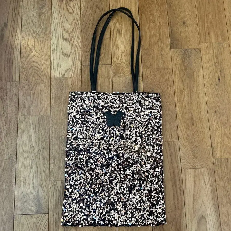 스팽글 장식의 토트백, 나비 로고 포함. - 디자인: 스팽글 장식의 토트백 - 색상: 스팽글 - 특징: 나비 로고가 부착되어 있음 - 스트랩: 긴 핸들 포함 - 사이즈: 세로 36cm, 가로 26cm, 바닥 없음 방문해 주셔서 감사합니다.