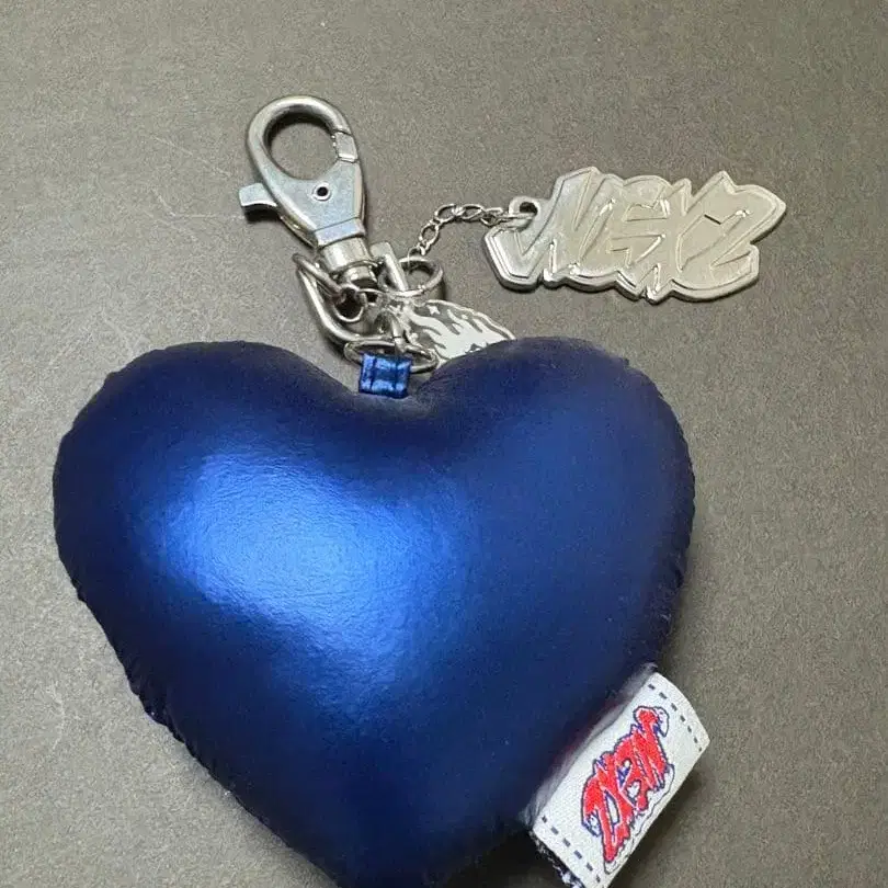 네이비 색상의 합성 피혁 소재 하트 모양 키링입니다. 클립이 달려 있어 편리합니다.