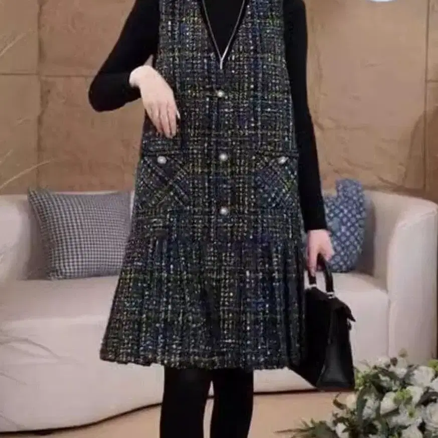 블랙과 파랑 트위드 소재의 슬리브리스 원피스, 장식적인 버튼과 플레어 스커트가 특징입니다.
