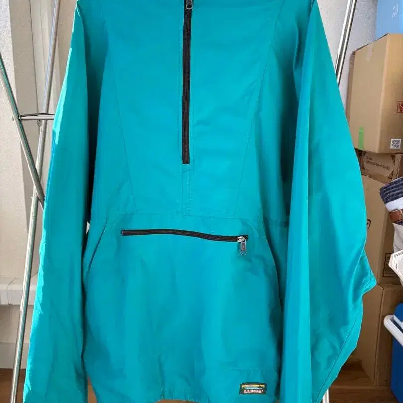 터콰이즈 풀오버 나일론 자켓, 프론트 지퍼 포켓 부착. - 브랜드: L.L.Bean - 색상: 터콰이즈 - 스타일: 풀오버 - 포켓: 프론트 지퍼 포켓 - 후드: 후드 부착 사이즈 - XL(LL)