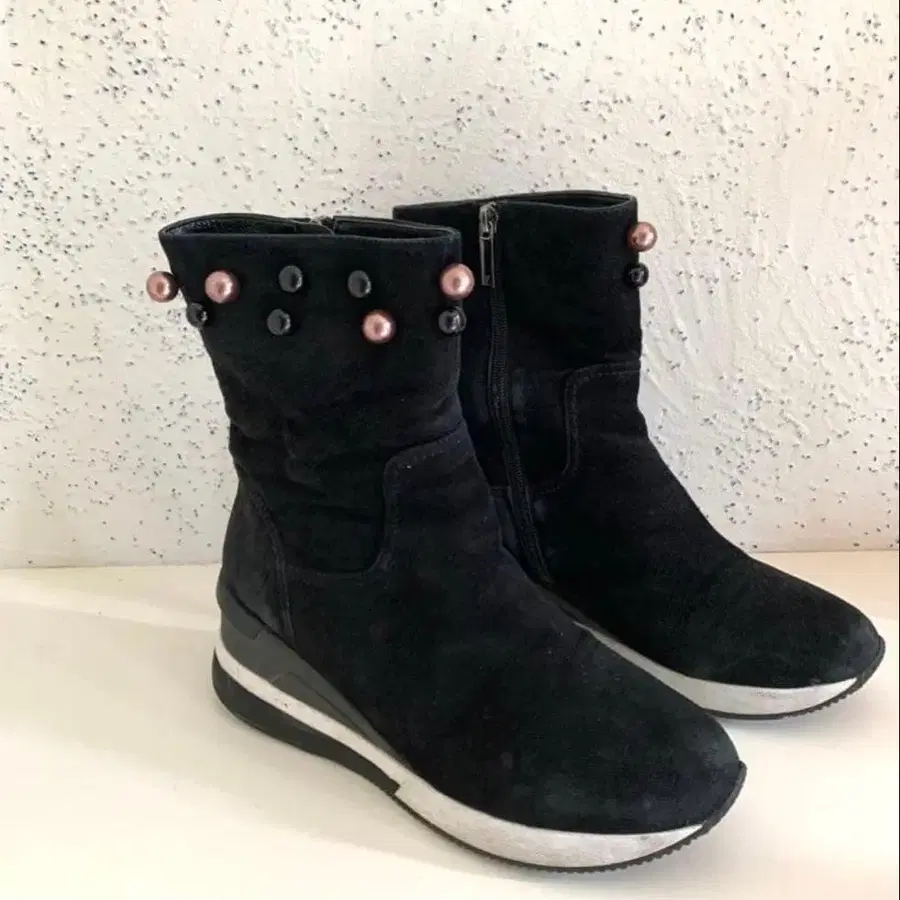 블랙 스웨이드 미들컷 부츠 펄 버튼 39