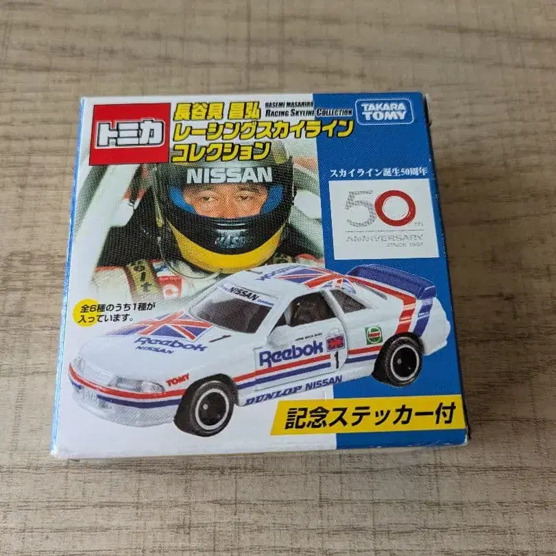 리복 로고와 영국 국기가 디자인된 화이트 스카이라인 미니카, 50주년 기념 스티커 포함.