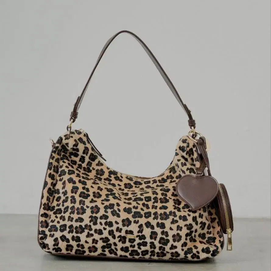 레오파드 무늬 디자인의 토트백, 하트 모양 참 포함으로 스타일리시합니다.