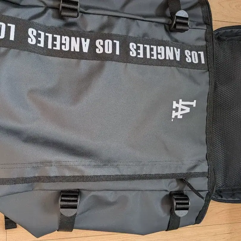 로스앤젤레스 로고가 새겨진 그레이 백팩으로, 메쉬 포켓과 칸막이가 있어 수납력이 뛰어납니다.