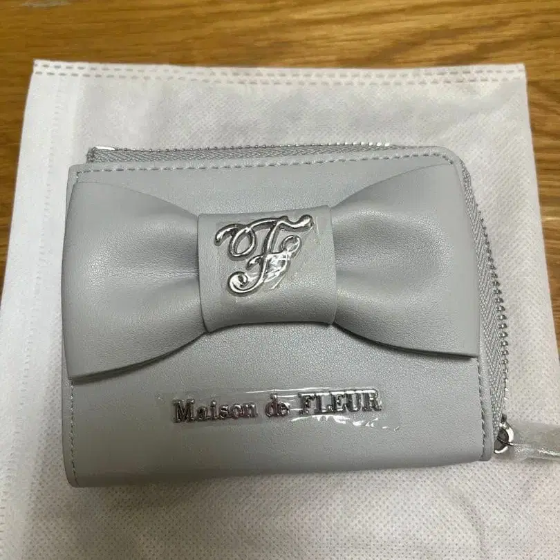 리본이 달린 색스 블루 색상의 카드 케이스입니다. 내부에 지퍼가 달린 동전 지갑과 카드 포켓이 있습니다.