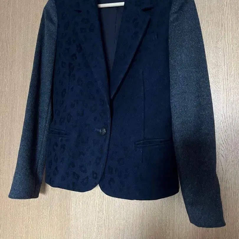 레오파드 무늬의 앞면과 그레이 울 소매를 가진 테일러드 자켓.