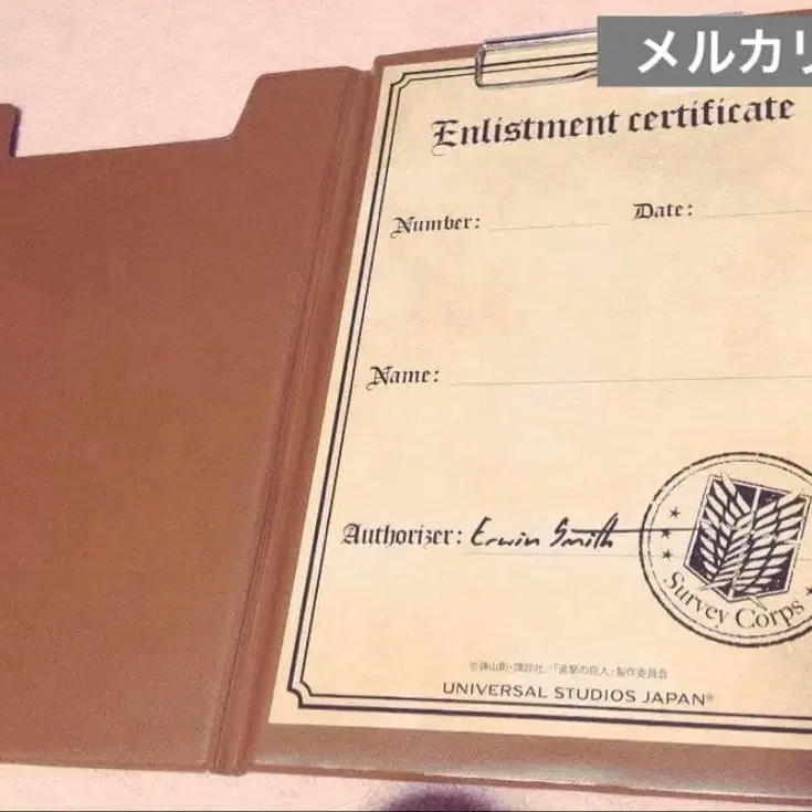 조사병단의 서류에 엘빈 단장의 사인이 인쇄되어 있습니다. 타이틀 - 진격의 거인 진격의 거인/캐릭터명 - 엘빈 스미스 아이템/종류 - 문구