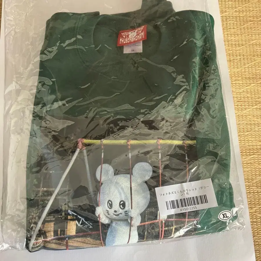 KYUSONEKOKAMI 캐릭터가 프린트된 XL 사이즈의 다크 그린 T셔츠.