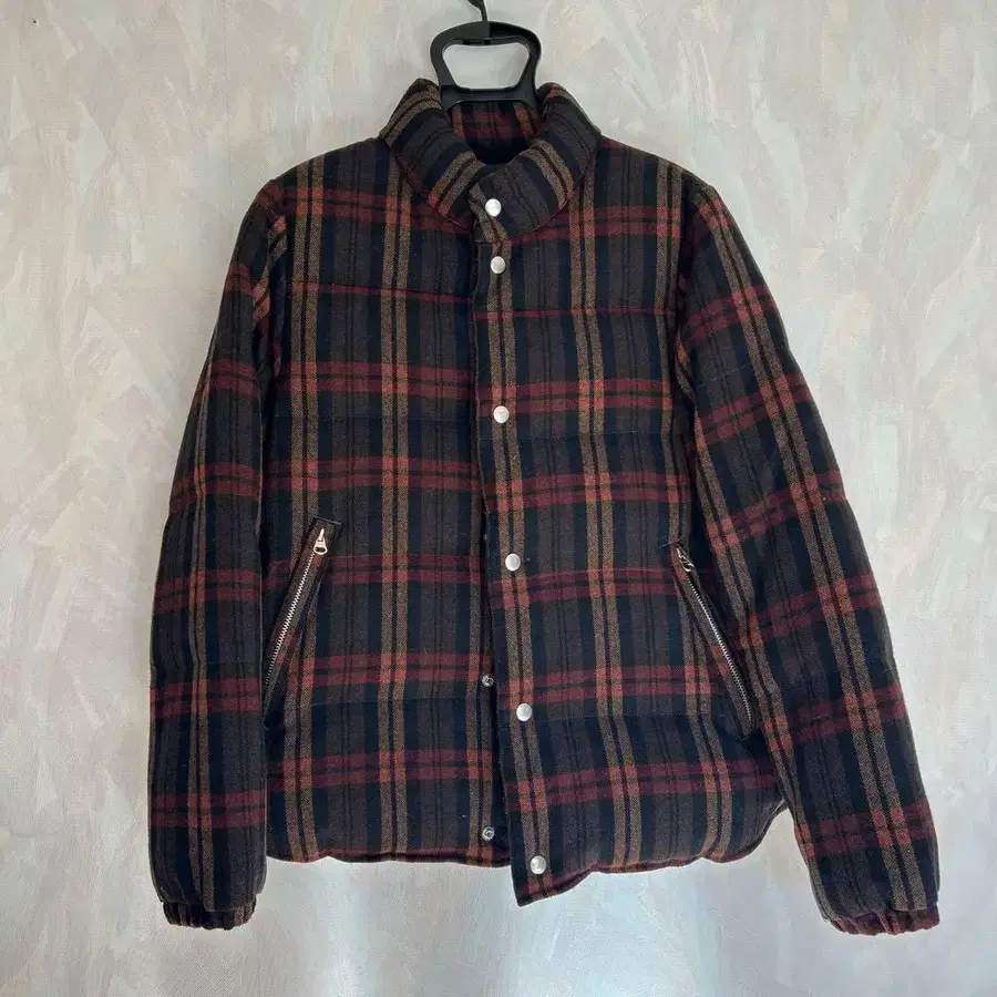 체크 무늬 다운 자켓, 스탠드 카라, 지퍼 포켓 부착으로 방한성이 뛰어납니다. - 색상: 체크 무늬 ( 블랙, 빨간색, 브라운 ) - 디자인: 다운 자켓, 단추식, 지퍼 포켓 - 소매: 리브 부착 - 옷깃: 스탠드 카라 - 안감: 무지 블랙 컬러, 안쪽 포켓 있음 - 포켓: 지퍼 부착 사이드 포켓 - 총길이 64cm ( 옷깃 부분 아래 ) - 소매 길이 63cm - 가슴 너비 52cm 흠집, 얼룩 등은 없지만 몇 번 착용했기 때문에 약간의 사용감이 있습니다.