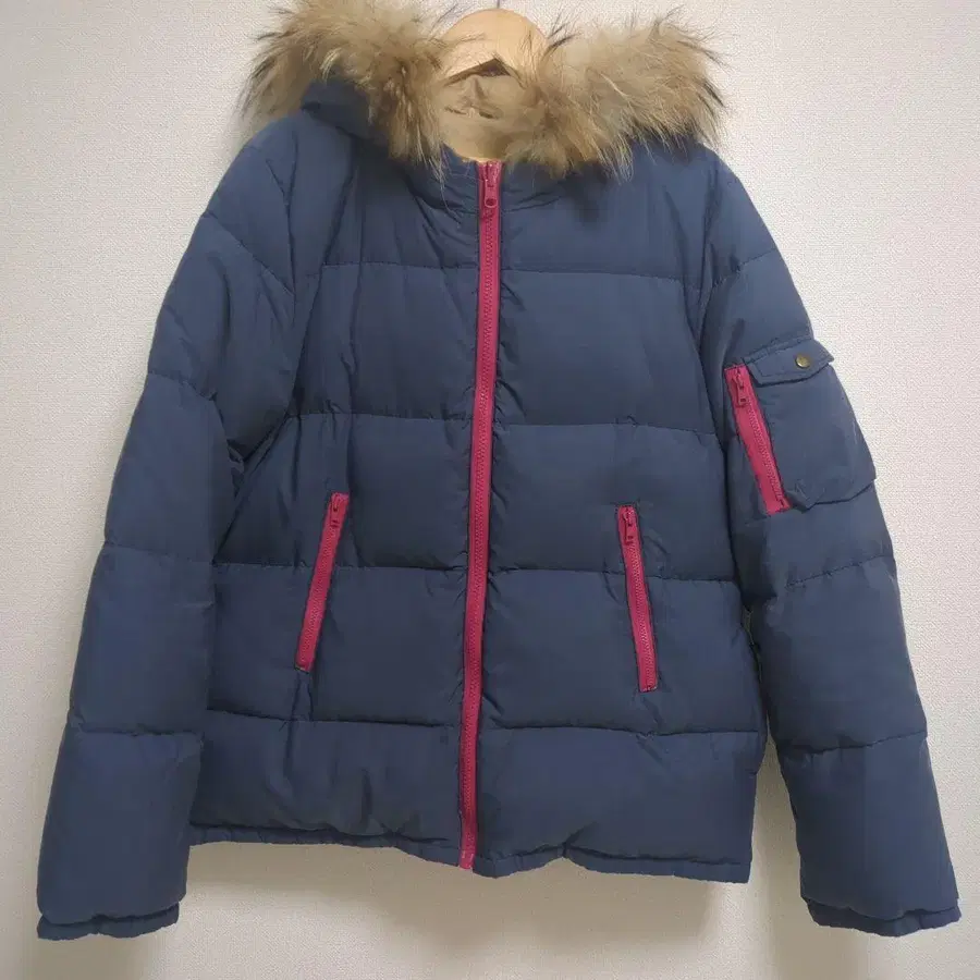 약간 색이 바랜 듯한 탁한 블루 색상에 핑크색 지퍼가 귀여운 다운 자켓입니다.