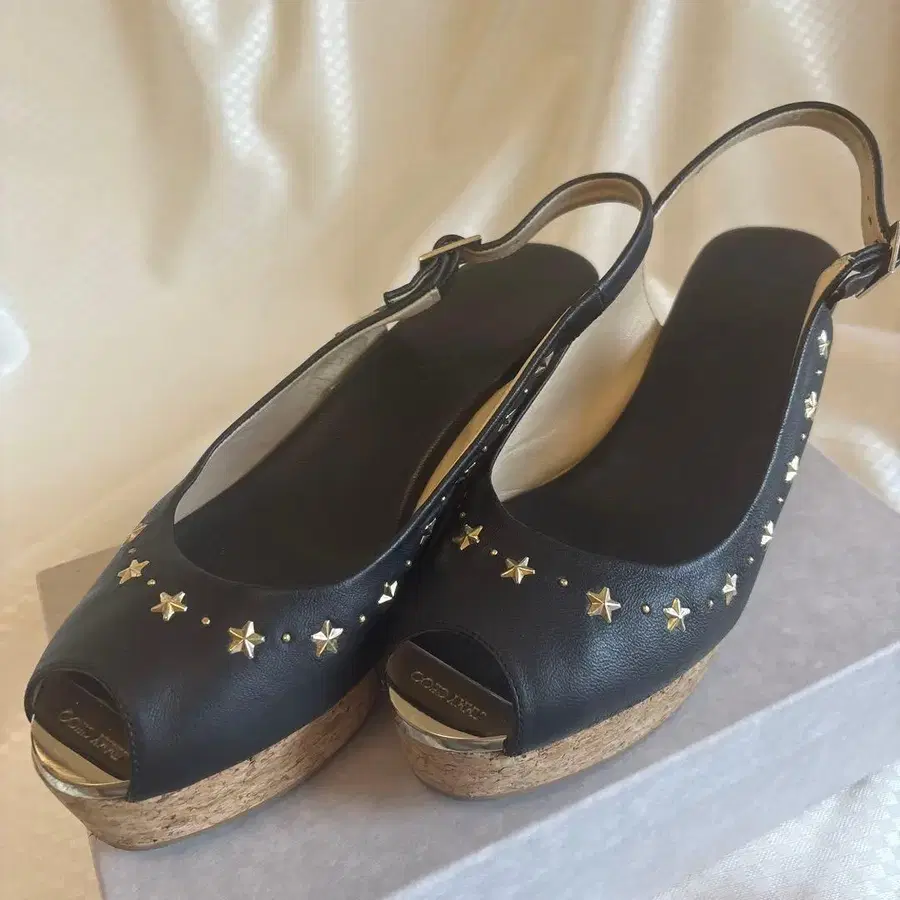 별 모양 스터드가 장식된 블랙 오픈토 샌들. 코르크 밑창으로 쾌적한 착용감.