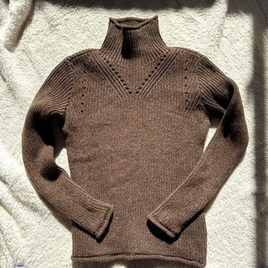 리브 편직 터틀넥 스웨터, 시스루 편직 디테일이 특징입니다. - 색상: 브라운 - 디자인: 터틀넥 - 소재: 니트 - 스타일: 리브 편직 - 특징: 시스루 편직 디테일 사이즈 M 캐시미어 블렌드 정가 6만 방문해 주셔서 감사합니다.