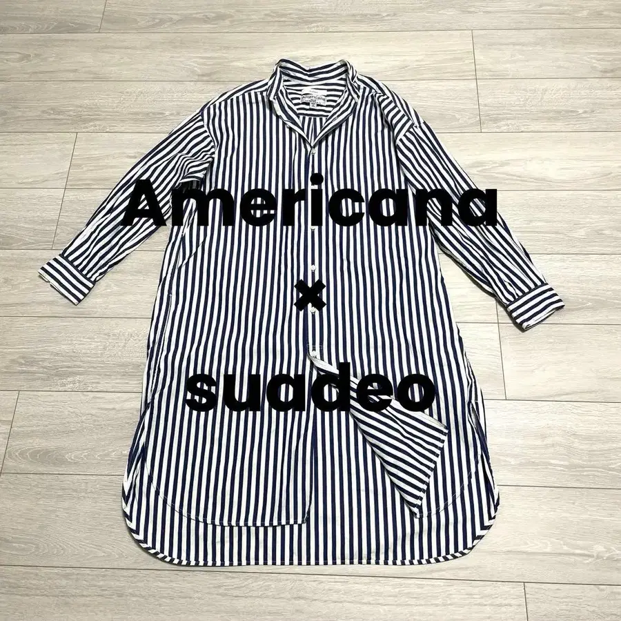 자동 번역되었어요. 원문보기Americana x suadeo 콜라보 셔츠 원피스입니다. 청결감이 있는 화이트와 네이비 스트라이프로, 코튼 100%라 착용감이 뛰어납니다.