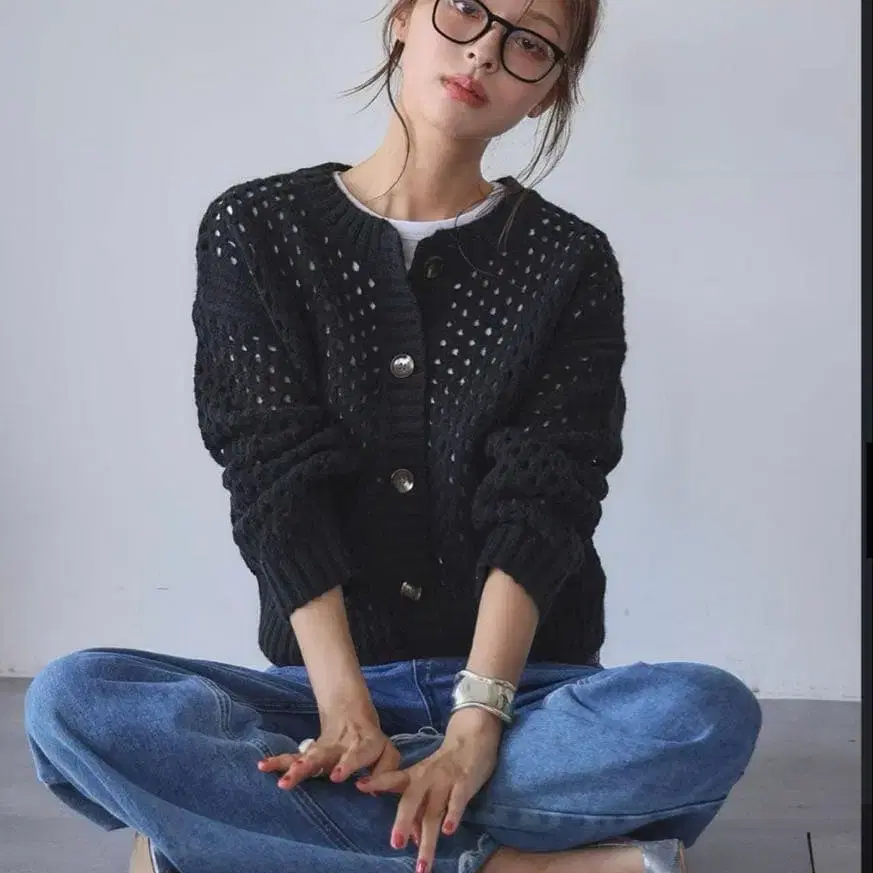 로페피크닉 골드 버튼 루프 편직 니트 가디건 블랙