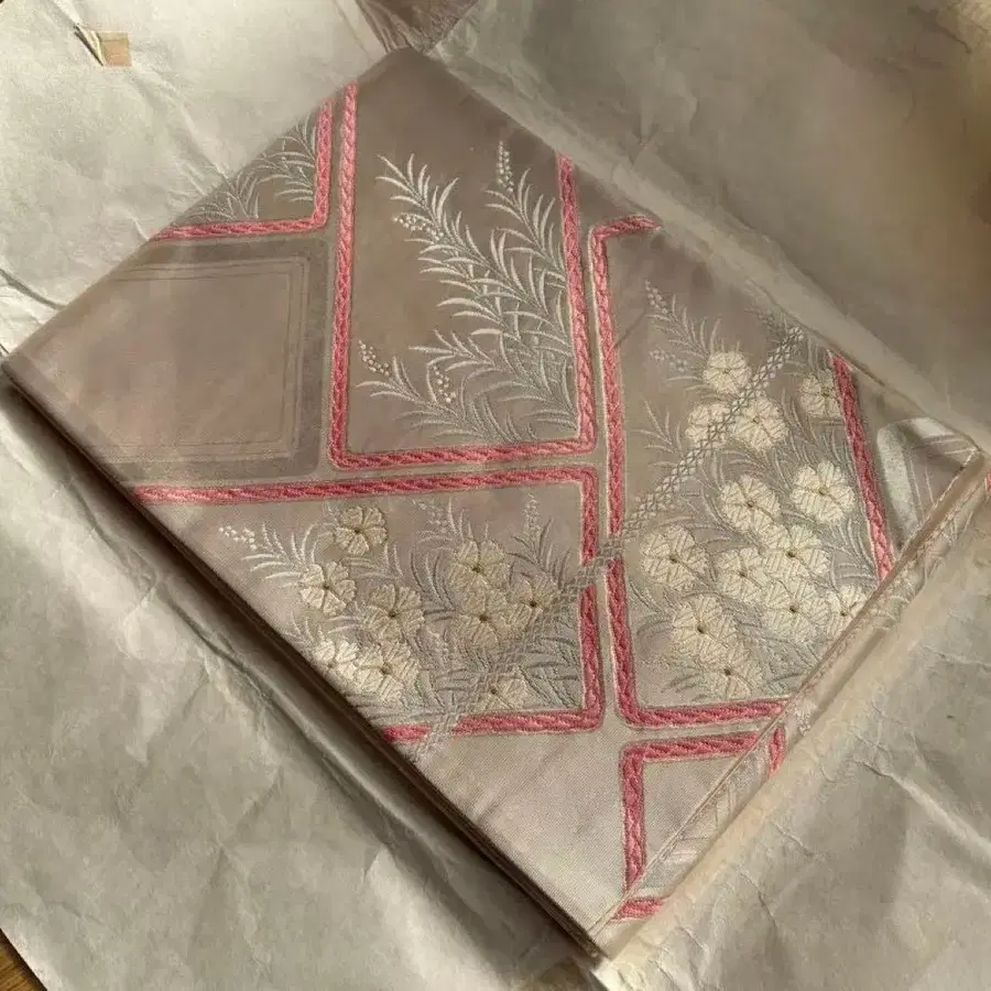 실크 후쿠로 오비, 꽃무늬 자수가 아름다운 디자인.