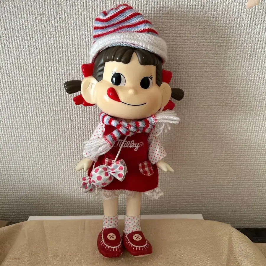 빨간색과 화이트 스트라이프 모자를 쓴 페코짱 캐릭터 인형.