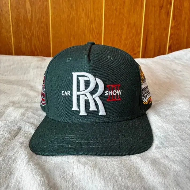 릭 로스의 캐릭터와 자동차 자수가 들어간 다크 그린 스냅백 캡.