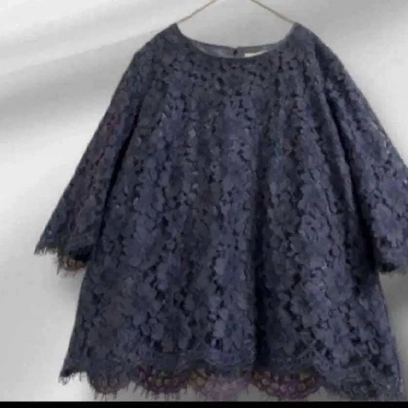 네이비 색상의 레이스 소재 상의입니다. 튜닉 기장으로 편안하게 착용 가능합니다. 소매와 밑단의 스캘럽 디자인이 사랑스럽습니다.