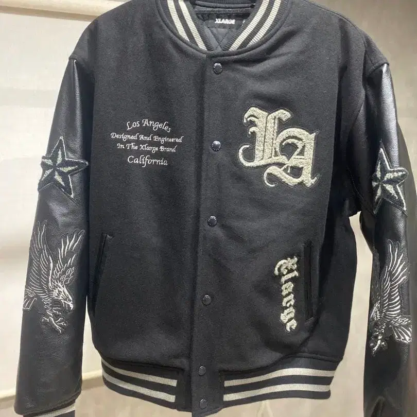 전체에 배치된 자수와 사가 자수가 특징인 바시티 자켓입니다.