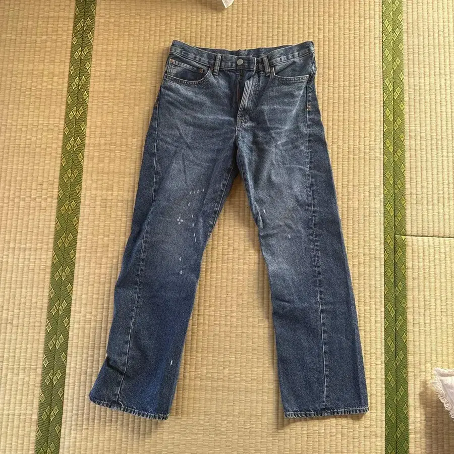 GU 페인트 가공 블루 스트레이트 데님 팬츠