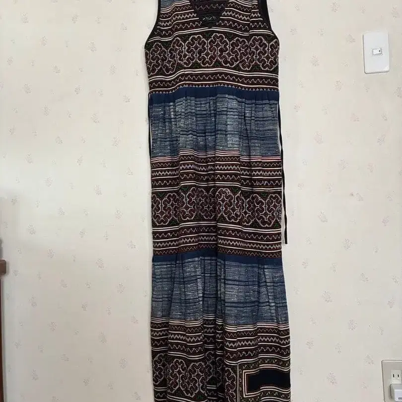 자동 번역되었어요. 원문보기기하학 패턴의 슬리브리스 맥시 드레스, 플레어 스커트 디자인.