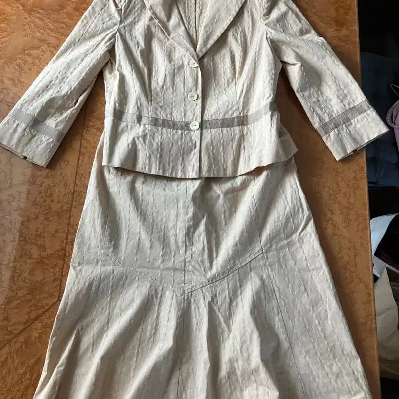 아이보리 색상의 주름 가공 자켓과 플레어 스커트 세트. - 색상: 아이보리 - 디자인: 자켓과 스커트 세트 - 소매 스타일: 7부 소매 - 버튼 개수: 3개 - 소재: 주름 가공된 원단 - 스커트 스타일: 플레어 스커트 방문해 주셔서 감사합니다.