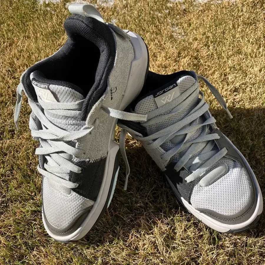 통기성 있는 메쉬 소재를 사용한 그레이와 화이트의 로우컷 스니커즈. - 브랜드: Jordan - 색상: 그레이/화이트 - 스타일: 스니커즈 - 디자인: 로우컷 - 특징: 통기성 있는 메쉬 소재 방문해 주셔서 감사합니다. 사이즈 - 25.5cm