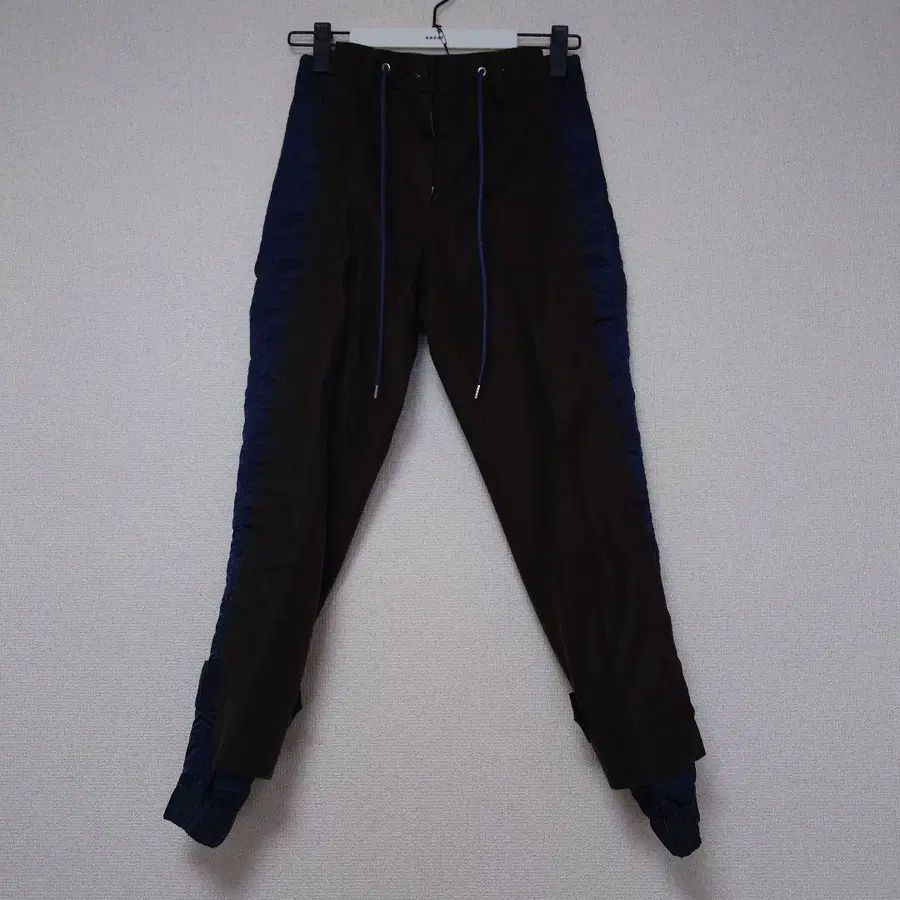 사이드에 네이비 스트라이프가 특징인 슬림핏 슬랙스.