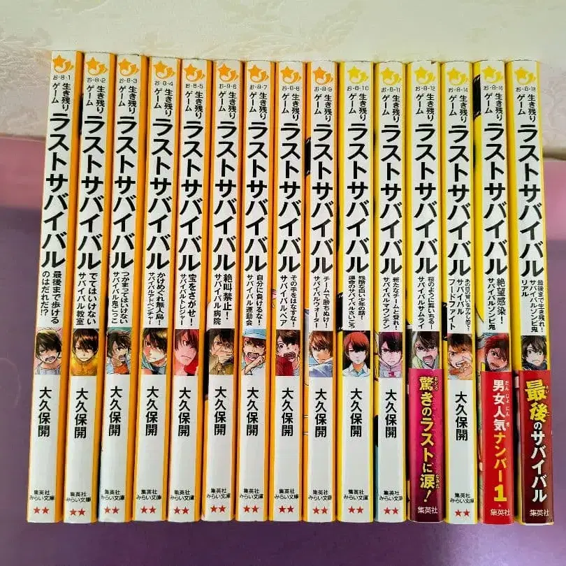 슈에이샤 미라이 문고 생존 게임 라스트 서바이벌 오쿠보 카이 시리즈 15권 세트 판매입니다. 라스트 서바이벌 마지막까지 걸을 수 있는 건 누구!? 라스트 서바이벌 나와서는 안 되는 서바이벌 교실 라스트 서바이벌 잡혀서는 안 되는 서바이벌 술래잡기 라스트 서바이벌 달려라 무인도! 서바이벌 어드벤처 라스트 서바이벌 보물을 찾아라! 서바이벌 트레저 라스트 서바이벌 비명 금지! 서바이벌 병원 라스트 서바이벌 자신에게 지지 마! 서바이벌 운동회 라스트 서바이벌 그 손을 놓지 마! 서바이벌 페어 라스트 서바이벌 팀으로 이겨내라! 서바이벌 워터 라스트 서바이벌 잔혹한 하얀 소년의 이야기! 운명의 서바이벌 주사위 라스트 서바이벌 새로운 팀과 올라라! 서바이벌 마운틴 라스트 서바이벌 벚꽃처럼 흩날려라! 서바이벌 사무라이 라스트 서바이벌 그날의 맹세를 되새기며! 서바이벌 푸드 파이트 라스트 서바이벌 절망 감염! 서바이벌 좀비 귀신 라스트 서바이벌 마지막까지 살아남아라! 서바이벌 좀비 귀신 리얼 상기 15권의 세트 판매이며, 낱개 판매는 하지 않습니다. 상태는 일반적인 중고 상품으로 생각해주세요. 약간의 사용감이나 커버 상단의 구김 등이 있습니다. 새상품급에こだ지시는 분은 삼가주세요. 가격 인하는 죄송합니다.