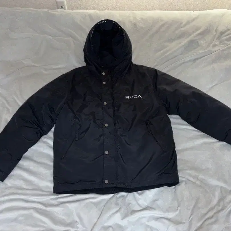 RVCA의 블랙 후드 부착 나일론 자켓, 단추식으로 사이드 포켓이 있습니다.