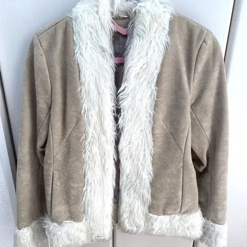 인조 모피 트리밍이 특징인 베이지 자켓. - 색상: 베이지 - 소재: 인조 모피, 스웨이드 - 안감 색상: 옅은 핑크 몇 번 사용했습니다. 안감과 퍼가 있어 따뜻합니다.