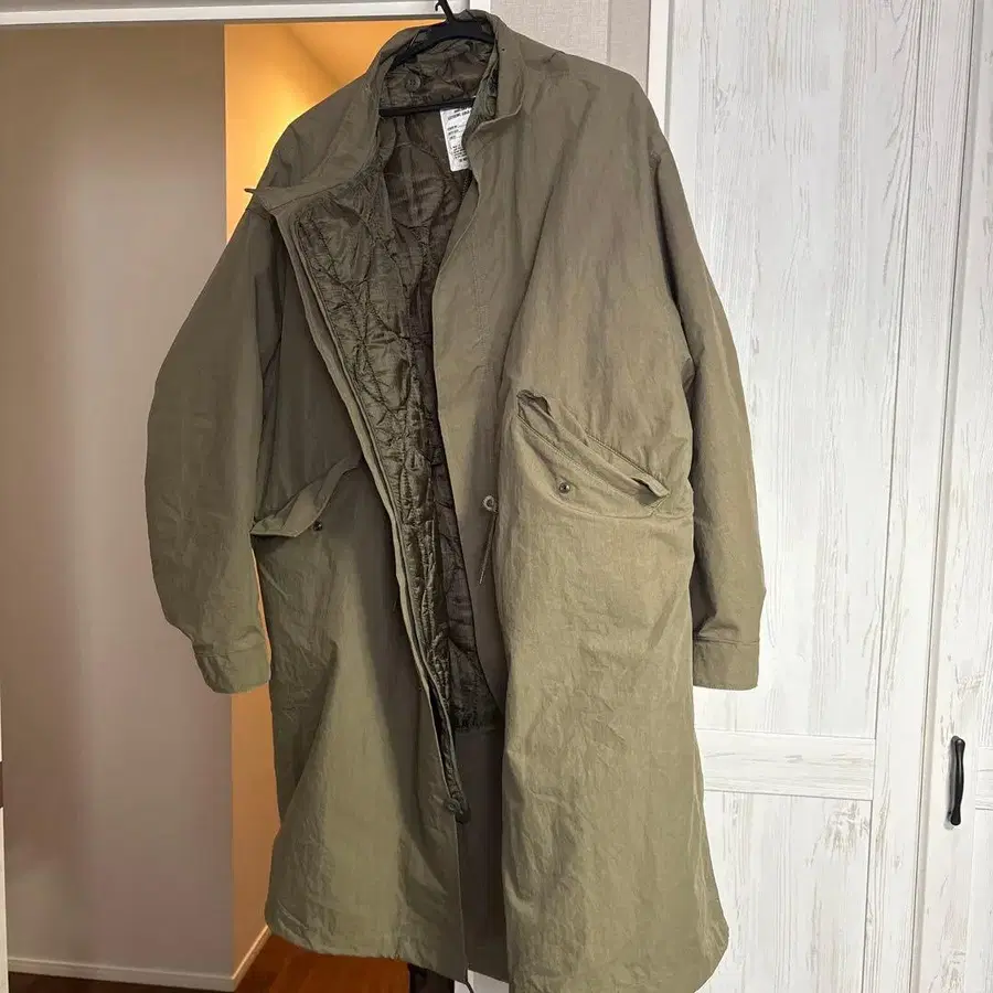 올리브 색상의 퀼팅 안감 모즈 코트, 드로우 스트링으로 조절 가능. - 색상: 올리브 - 디자인: 퀼팅 안감 포함 - 스타일: 모즈 코트 - 특징: 드로우 스트링 포함 기장: 104/76.5 어깨 너비: 62/61.5 소매 길이: 60/55