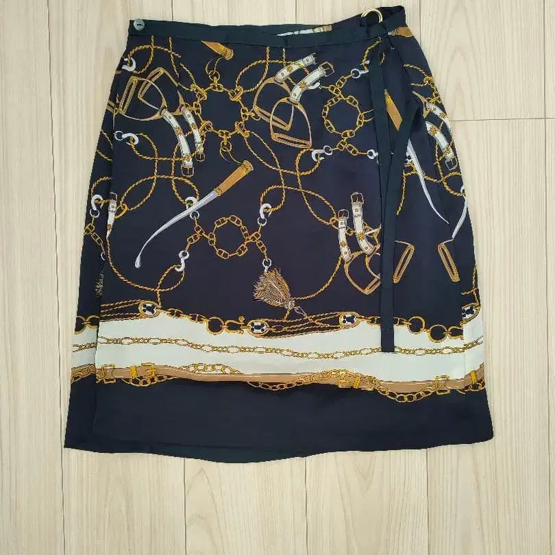 스카프 패턴의 랩 스커트입니다. 무지 네이비 쪽을 안쪽으로 하여 입는 것도 가능합니다. 사이즈 38 허리 62-64 힙 88-91 폴리에스테르 100%