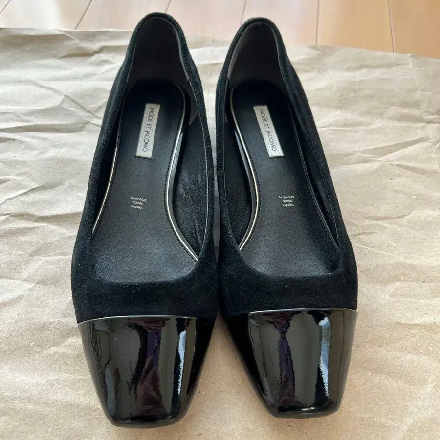 발가락 부분은 스퀘어 느낌이며 에나멜 특유의 광택 있는 소재입니다. 그 외 외부 부분은 스웨이드 느낌의 소재입니다.