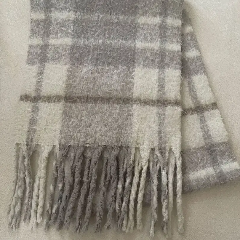 그레이지 베이스의 체크 무늬의 복슬복슬한 질감의 스톨입니다. - 색상: 화이트/그레이/베이지 체크 무늬 - 소재: 복슬복슬한 질감 - 프린지: 있음 방문해 주셔서 감사합니다. 얼굴 주변 색이 확 밝아지는 배색의 머플러입니다.