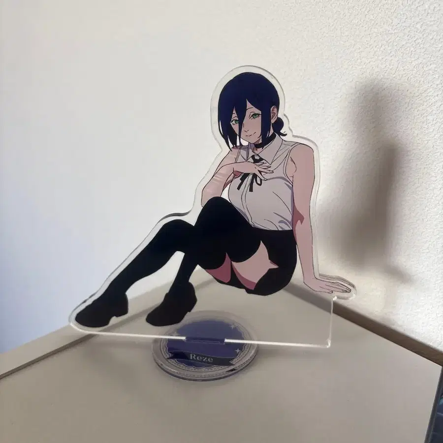 앉아있는 포즈의 Reze 아크릴 스탠드, 스타일리시한 디자인. - 캐릭터명: Reze - 디자인: 아크릴 스탠드 - 색상: 다색 (주로 블랙, 화이트) - 포즈: 앉아있는 - 스탠드 모양: 원형 방문해 주셔서 감사합니다.