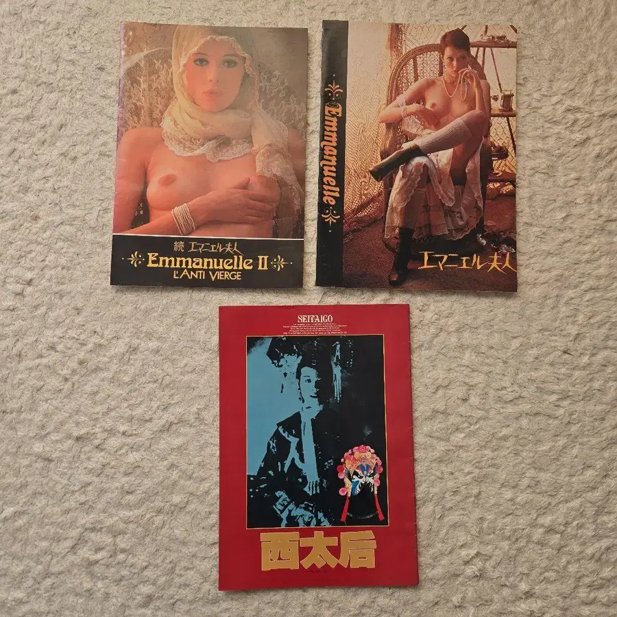 엠마뉴엘 II 특별판과 서태후의 작품을 포함한 컬렉션. - 타이틀: 엠마뉴엘 부인 (Emmanuelle II L'Anti Vierge) - 타이틀: 속 엠마뉴엘 부인 (Emmanuelle II) - 타이틀: 서태후 방문해 주셔서 감사합니다. 조부모님의 정리 과정에서 나온 물건입니다.