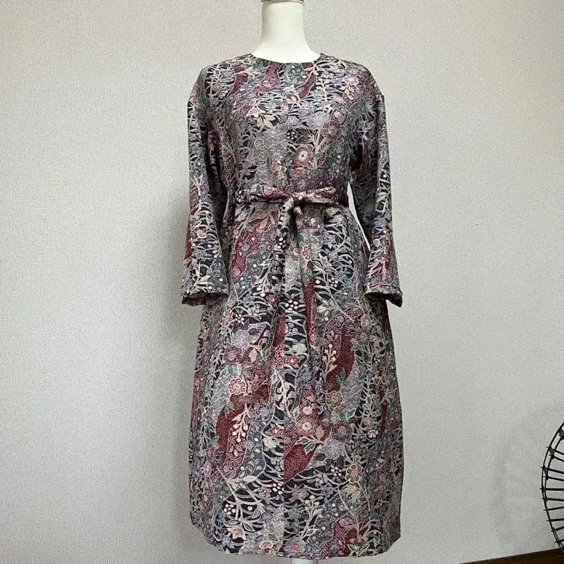 순수 실크 크레이프 원단 기모노 리메이크 원피스 고급 크레이프 원단 코몬이었기에 원피스로 만들어 보았습니다. 차분함 속에 화려함이 있는 고급스러운 색상 패턴입니다. 이미지대로의 상품이 나와 판매합니다. ♦︎ 순수 실크 크레이프 원단 특유의 부드럽고 촉촉한 원단입니다. 촉감이 좋고 유연한 착용감입니다. 풀어낸 후 세탁 세제로 세탁하여 유연하게 마무리했습니다. ♦︎ 20cm 지퍼를 달았습니다. ♦︎ 허리 부분에서 절개하여 너무 넓게 퍼지지 않는, 고급스러운 A라인으로 완성했습니다. 사이즈 기장 105cm 가슴 너비 50cm 넥라인 52cm 소매 길이 옷깃부터 63cm 밑단 둘레 136cm 뒷면 슬릿 있음 ※ 약간의 오차는 용서해 주세요. ※ 순수 실크 크레이프는 섬세한 상품이므로 손세탁을 권장합니다.