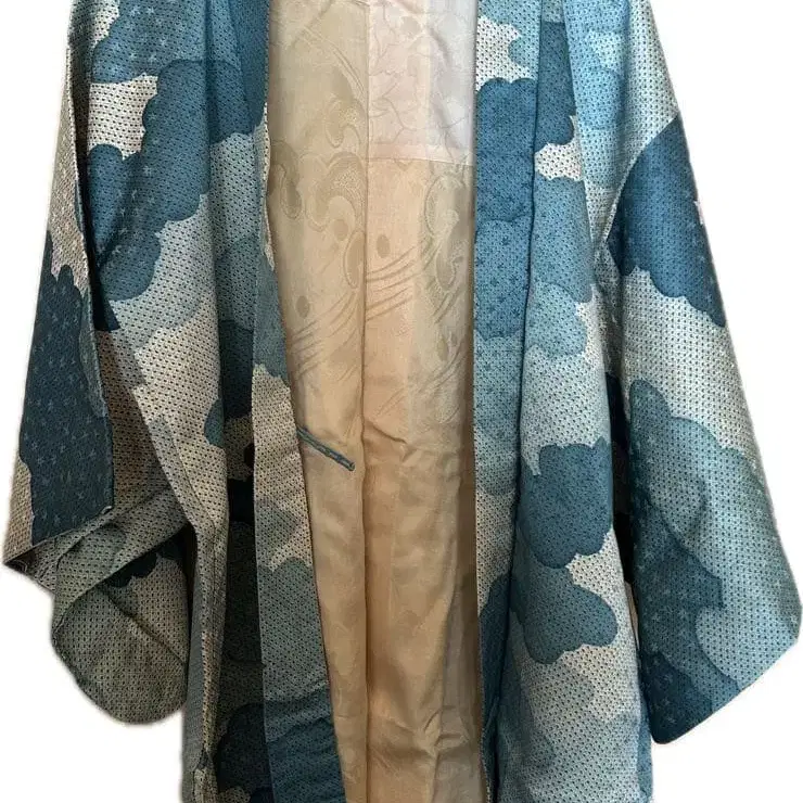 블루 계열의 구름 무늬 캐주얼 겉옷, 부드러운 원단과 넓은 소매가 특징.
