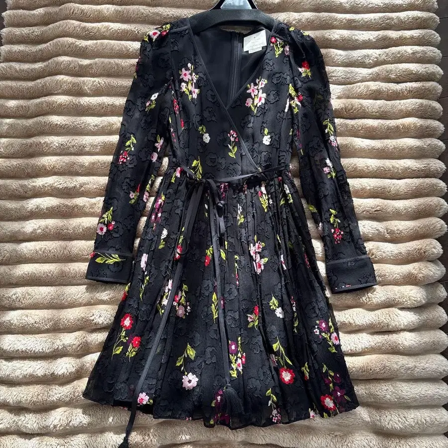 플라워 자수가 들어간 블랙 랩 드레스, 사이즈 2.