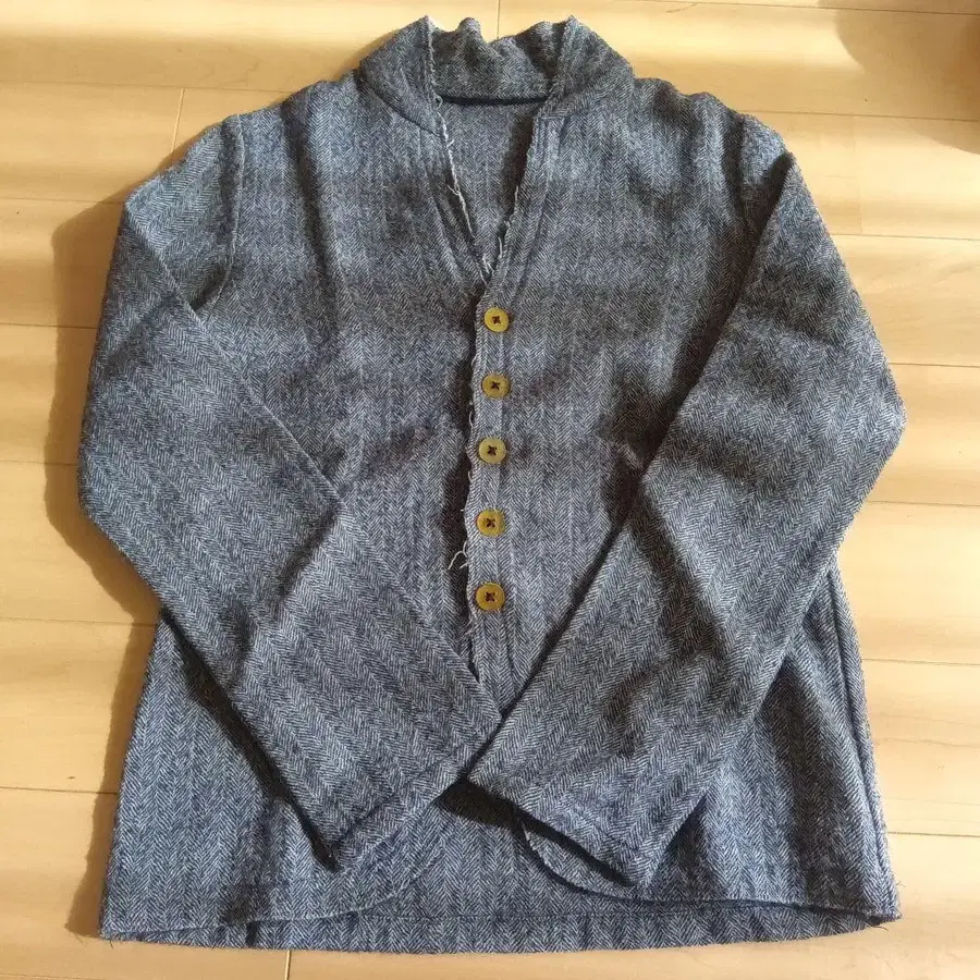 자동 번역되었어요. 원문보기울 100% 헤링본 직조 긴팔 셔츠, 노란색 버튼 포함.