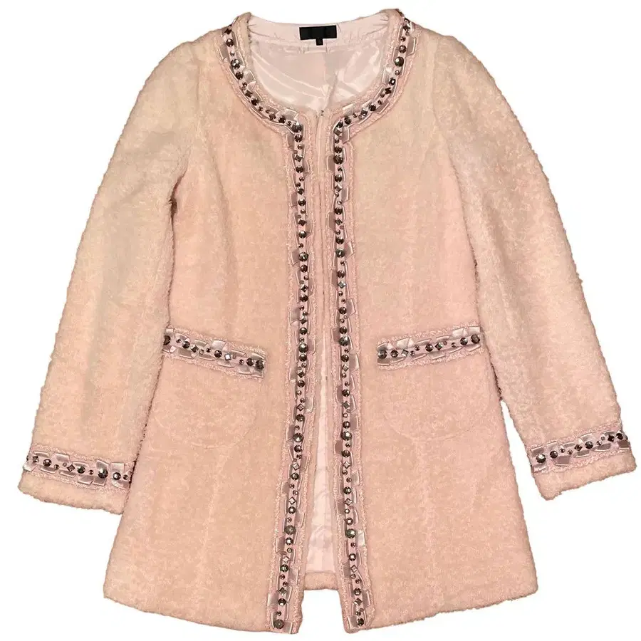 실버 색상의 다이아몬드 같은 비즈 장식이 되어 있어 고져스해 보입니다! 원단은 라이트 핑크 색상으로 부드러운 소재입니다. 사이즈는 II (M 정도)이며, 무릎~무릎 위 기장입니다. 앞은 후크로 여미도록 되어 있습니다. 가족이 백화점에서 구매한 것입니다. 집 옷장을 정리하고 싶어서 판매합니다. 정가는 모르겠지만, 브랜드 제품이라 좋은 가격에 구매했다고 들었습니다. 겨울부터 봄까지 어떠신가요? 검토 부탁드립니다.