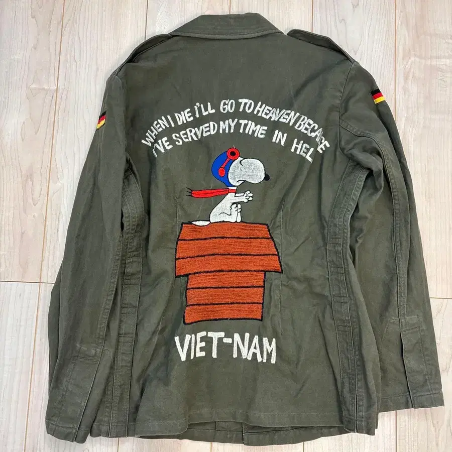 스누피 자수가 들어간 올리브 드라브 밀리터리 자켓.