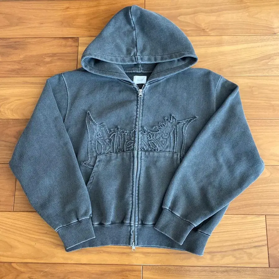 프론트 지퍼가 달린 다크 그레이 후드티, 자수 디자인 포함. 2~3회 착용하여 상태 좋습니다! - 색상: 다크 그레이 - 디자인: 프론트 지퍼, 후드 부착 - 포켓: 프론트 포켓 있음 - 소재: 맨투맨 소재 - 특징: 자수 디자인 방문해 주셔서 감사합니다.