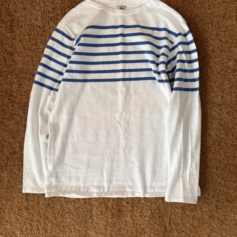 화이트와 블루 스트라이프 디자인의 긴팔 티셔츠.