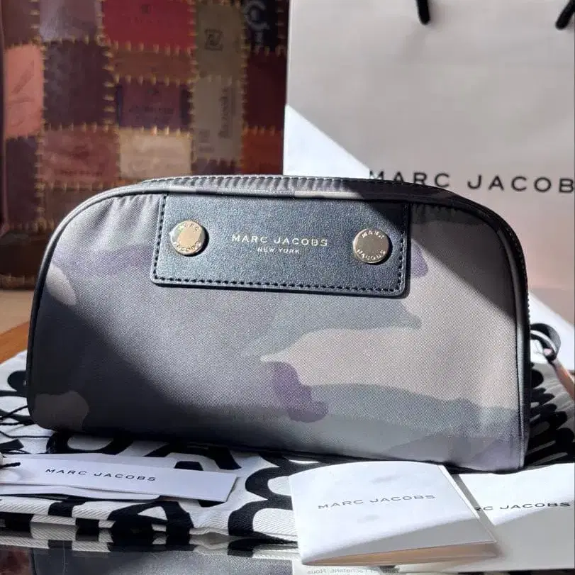 카모플라쥬 디자인의 나일론 파우치, 골드 지퍼 포함.