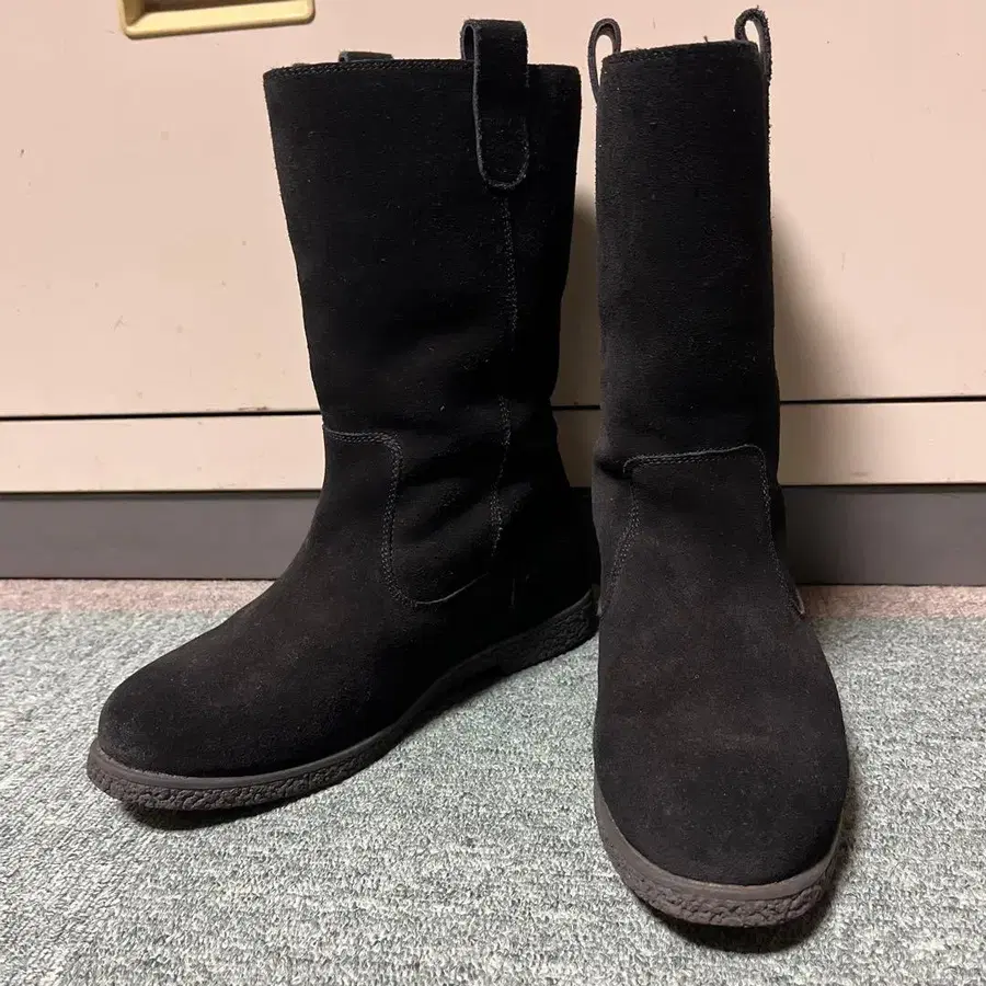 스웨이드 소재의 블랙 롱 어그 부츠, 러버 솔로 내구성 있음.